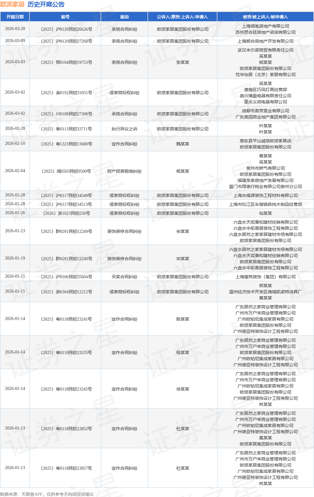 案号:(2026)浙1023民初258号根据统计,近一年内以欧派家居集团股份有限公司为当事人的历史开庭公告有251则,其中案由为“侵害商标权纠纷”的公告以67则居首,其次为“承揽合同纠纷”有40则,“买卖合同纠纷”有39则。历史开庭公告(前20条)如下:
