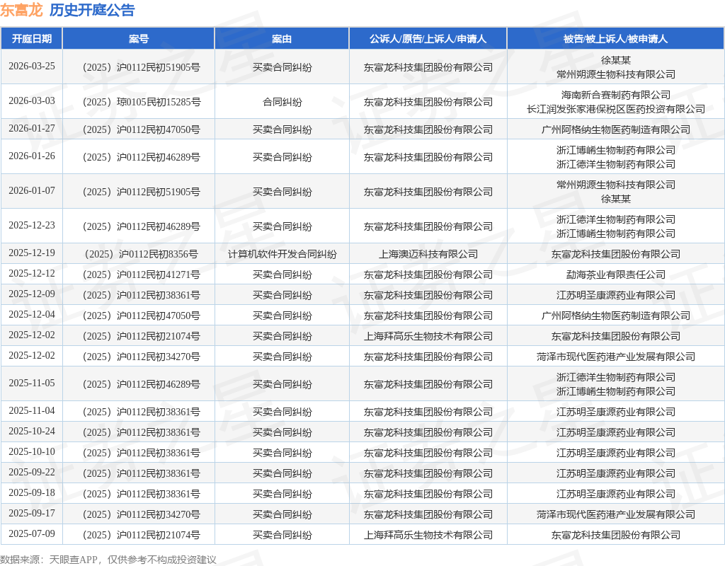 案号:(2025)沪0112民初46289号根据统计,近一年内以东富龙科技集团股份有限公司为当事人的历史开庭公告有40则,其中案由为“买卖合同纠纷”的公告以36则居首,其次为“劳动合同纠纷”有2则,“合同纠纷”有1则。历史开庭公告(前20条)如下: