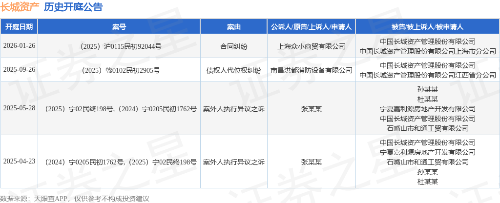 证券之星消息,根据天眼查APP显示,近日公布了一则中国长城资产管理股份有限公司作为被告/被上诉人的开庭公告,详细内容如下:
