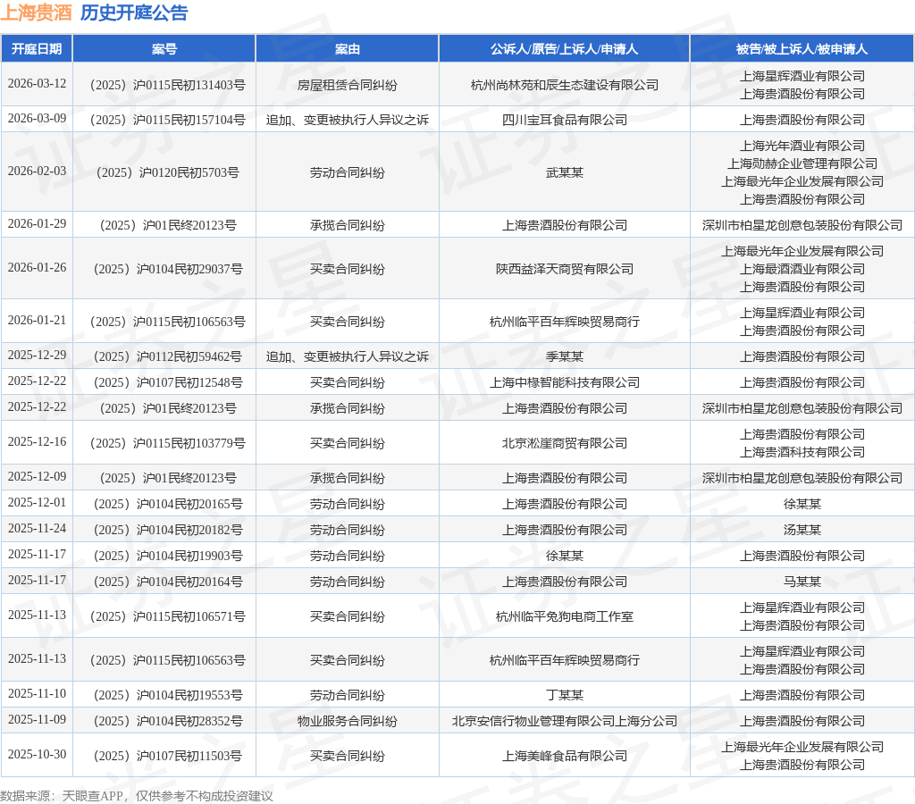 案号:(2025)沪0104民初29037号根据统计,近一年内以上海贵酒股份有限公司为当事人的历史开庭公告有91则,其中案由为“劳动合同纠纷”的公告以36则居首,其次为“合同纠纷”有12则,“承揽合同纠纷”有11则。历史开庭公告(前20条)如下:
