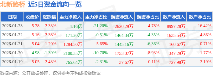 证券之星消息,截至2026年1月23日收盘,北新路桥(002307)报收于5.28元,上涨2.33%,换手率8.11%,成交量102.81万手,成交额5.48亿元。