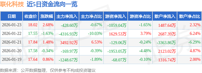 证券之星消息,截至2026年1月23日收盘,联化科技(002250)报收于18.02元,上涨2.68%,换手率4.01%,成交量35.85万手,成交额6.42亿元。