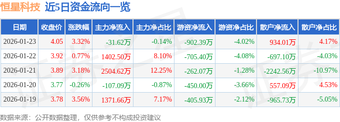 证券之星消息,截至2026年1月23日收盘,恒星科技(002132)报收于4.05元,上涨3.32%,换手率3.98%,成交量55.68万手,成交额2.24亿元。