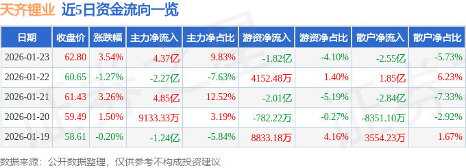 证券之星消息,截至2026年1月23日收盘,天齐锂业(002466)报收于62.8元,上涨3.54%,换手率4.83%,成交量71.25万手,成交额44.46亿元。