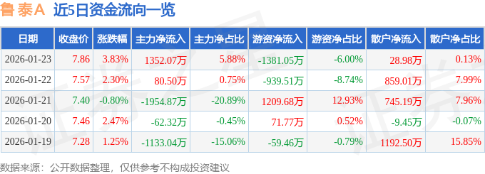 证券之星消息,截至2026年1月23日收盘,鲁 泰A(000726)报收于7.86元,上涨3.83%,换手率4.98%,成交量29.34万手,成交额2.3亿元。
