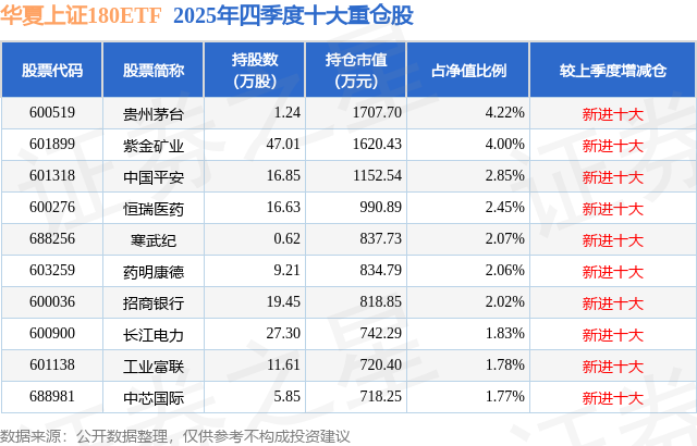 华夏上证180ETF基金成立于2025年10月20日,基金经理为赵宗庭,基金跟踪标的为上证180指数,成立以来超额回报为-2.15%,近一个月超额回报为0.06%。最新披露的基金持仓数据显示,截止2025年12月31日,该基金第一大重仓股为贵州茅台(600519),持股占比为4.22%。