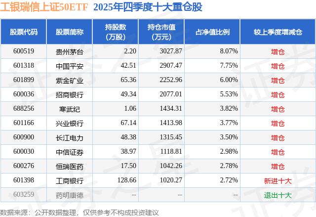 工银瑞信上证50ETF基金成立于2018年12月7日,基金经理为赵栩,基金跟踪标的为上证50指数,成立以来超额回报为24.87%,近一个月超额回报为0.16%。最新披露的基金持仓数据显示,截止2025年12月31日,该基金第一大重仓股为贵州茅台(600519),持股占比为8.07%。