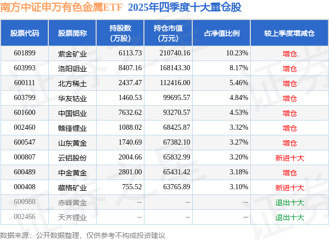 南方中证申万有色金属ETF基金成立于2017年8月3日,基金经理为崔蕾,基金跟踪标的为有色金属,成立以来超额回报为28.28%,近一个月超额回报为-0.07%。最新披露的基金持仓数据显示,截止2025年12月31日,该基金第一大重仓股为紫金矿业(601899),持股占比为10.23%。