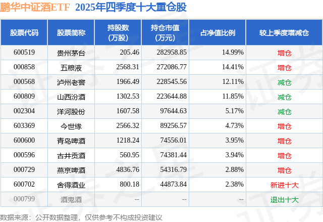 鹏华中证酒ETF基金成立于2019年4月4日,基金经理为张羽翔,基金跟踪标的为中证酒指数,成立以来超额回报为20.27%,近一个月超额回报为0.01%。最新披露的基金持仓数据显示,截止2025年12月31日,该基金第一大重仓股为贵州茅台(600519),持股占比为14.99%。