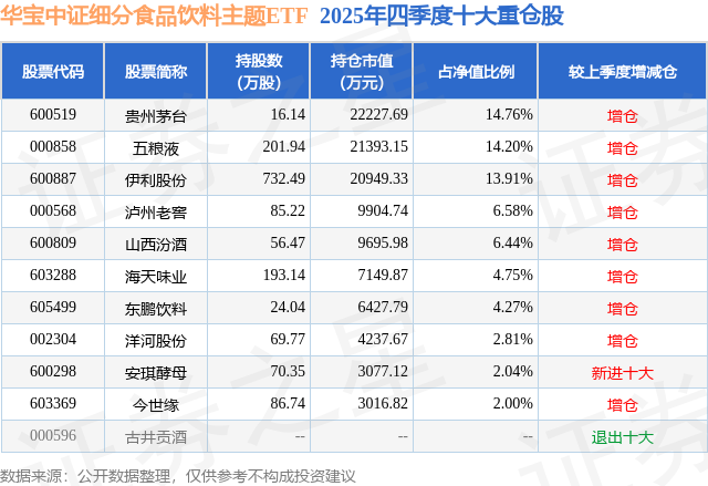 华宝中证细分食品饮料主题ETF基金成立于2020年12月24日,基金经理为蒋俊阳,基金跟踪标的为细分食品,成立以来超额回报为4.06%,近一个月超额回报为0.04%。最新披露的基金持仓数据显示,截止2025年12月31日,该基金第一大重仓股为贵州茅台(600519),持股占比为14.76%。