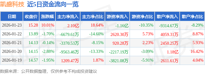 证券之星消息,截至2026年1月23日收盘,凯盛科技(600552)报收于15.28元,上涨10.01%,涨停,换手率7.97%,成交量75.31万手,成交额11.24亿元。