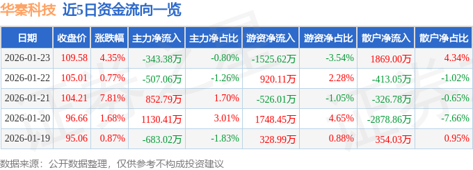 证券之星消息,截至2026年1月23日收盘,华秦科技(688281)报收于109.58元,上涨4.35%,换手率1.47%,成交量4.01万手,成交额4.31亿元。