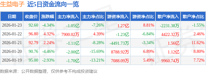 证券之星消息,截至2026年1月23日收盘,生益电子(688183)报收于92.6元,下跌4.34%,换手率1.86%,成交量15.48万手,成交额14.42亿元。