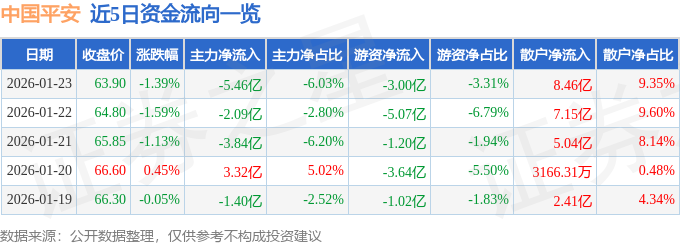 证券之星消息,截至2026年1月23日收盘,中国平安(601318)报收于63.9元,下跌1.39%,换手率1.32%,成交量140.77万手,成交额90.49亿元。