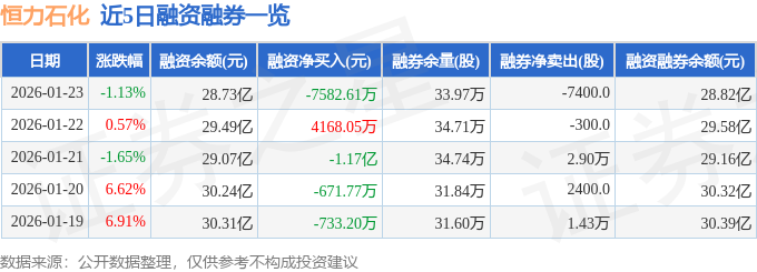 证券之星消息,截至2026年1月23日收盘,恒力石化(600346)报收于26.15元,下跌1.13%,换手率0.61%,成交量42.79万手,成交额11.27亿元。