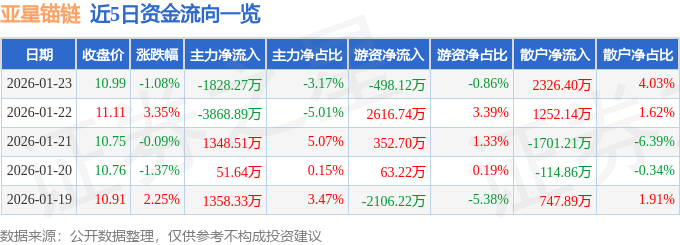 证券之星消息,截至2026年1月23日收盘,亚星锚链(601890)报收于10.99元,下跌1.08%,换手率5.48%,成交量52.56万手,成交额5.77亿元。