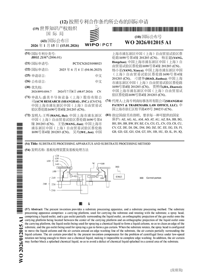 证券之星消息,根据企查查数据显示盛美上海(688082)公布了一项国际专利申请,专利名为“基板处理装置及基板处理方法”,专利申请号为PCT/CN2025/098923,国际公布日为2026年1月15日。