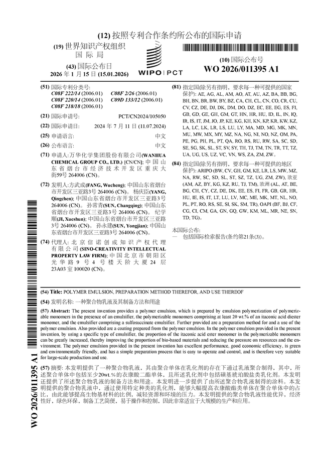 证券之星消息,根据企查查数据显示万华化学(600309)公布了一项国际专利申请,专利名为“一种聚合物乳液及其制备方法和用途”,专利申请号为PCT/CN2024/105050,国际公布日为2026年1月15日。