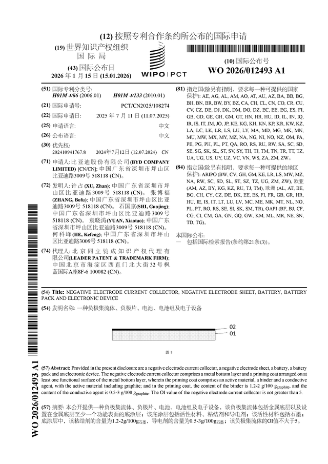 证券之星消息,根据企查查数据显示比亚迪(002594)公布了一项国际专利申请,专利名为“一种负极集流体、负极片、电池、电池组及电子设备”,专利申请号为PCT/CN2025/108274,国际公布日为2026年1月15日。