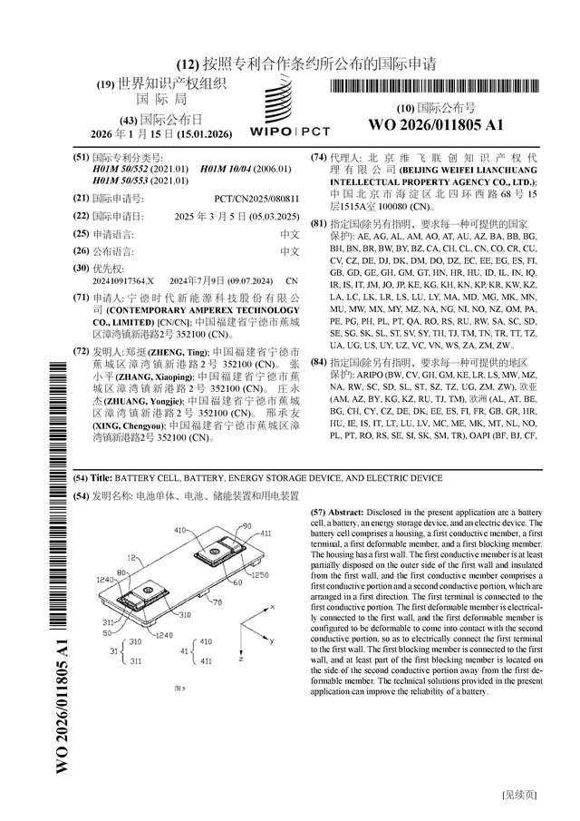 证券之星消息,根据企查查数据显示宁德时代(300750)公布了一项国际专利申请,专利名为“电池单体、电池、储能装置和用电装置”,专利申请号为PCT/CN2025/080811,国际公布日为2026年1月15日。