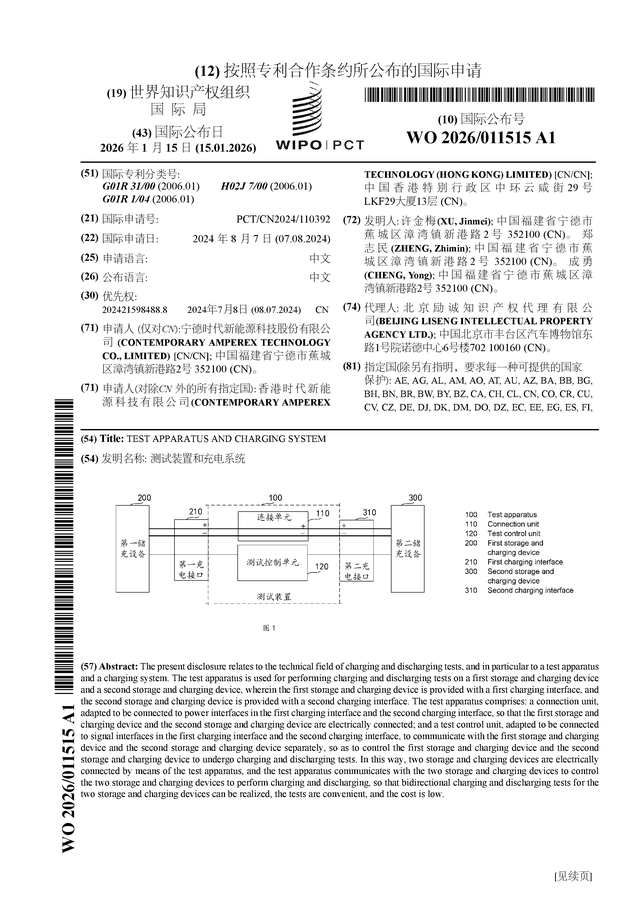 证券之星消息,根据企查查数据显示宁德时代(300750)公布了一项国际专利申请,专利名为“测试装置和充电系统”,专利申请号为PCT/CN2024/110392,国际公布日为2026年1月15日。