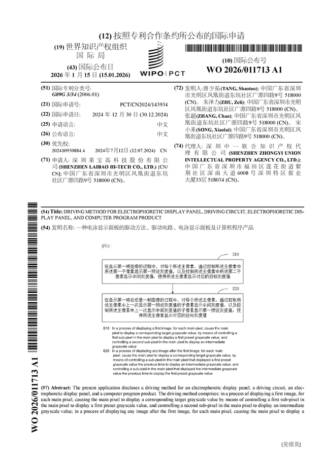 证券之星消息,根据企查查数据显示莱宝高科(002106)公布了一项国际专利申请,专利名为“一种电泳显示面板的驱动方法、驱动电路、电泳显示面板及计算机程序产品”,专利申请号为PCT/CN2024/143934,国际公布日为2026年1月15日。