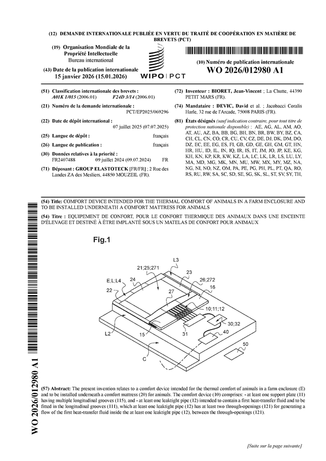 证券之星消息,根据企查查数据显示美的集团(000333)公布了一项国际专利申请,专利名为“COMFORT DEVICE INTENDED FOR THE THERMAL COMFORT OF ANIMALS IN A FARM ENCLOSURE AND TO BE INSTALLED UNDERNEATH A COMFORT MATTRESS FOR ANIMALS”,专利申请号为PCT/EP2025/069296,国际公布日为2026年1月15日。