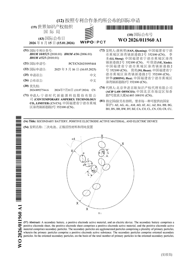 证券之星消息,根据企查查数据显示宁德时代(300750)公布了一项国际专利申请,专利名为“二次电池、正极活性材料和用电装置”,专利申请号为PCT/CN2025/095444,国际公布日为2026年1月15日。