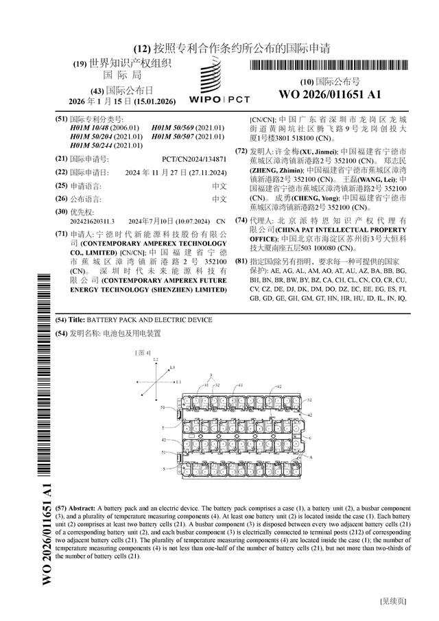 证券之星消息,根据企查查数据显示宁德时代(300750)公布了一项国际专利申请,专利名为“电池包及用电装置”,专利申请号为PCT/CN2024/134871,国际公布日为2026年1月15日。