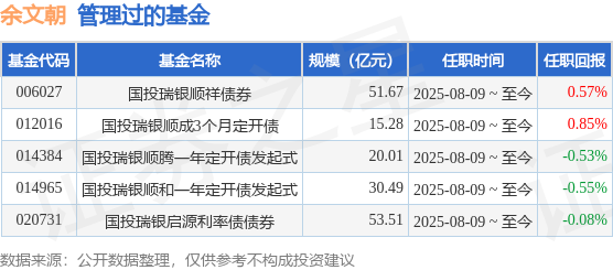 余文朝先生:中国籍,美国加利福尼亚大学洛杉矶分校金融工程硕士。2014年1月至2015年5月任PennyMac衍生品定价师,2015年8月至2019年11月任广发证券股份有限公司资本中介部投资经理,2019年11月至2024年12月任中国国际金融股份有限公司资产管理部副总经理,负责固定收益类资产的投资顾问和投资研究工作。2025年1月加入国投瑞银基金管理有限公司任顾问,2025年7月转入固定收益部拟任基金经理。2025年8月9日起担任国投瑞银顺腾一年定期开放债券型发起式证券投资基金、国投瑞银启源利率债债券型证券投资基金、国投瑞银顺祥定期开放债券型发起式证券投资基金、国投瑞银顺和一年定期开放债券型发起式证券投资基金、国投瑞银顺成3个月定期开放债券型证券投资基金基金经理。