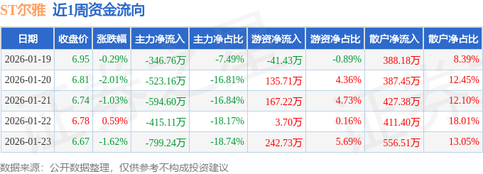 资金流向数据方面,本周ST尔雅主力资金合计净流出2678.86万元,游资资金合计净流入507.94万元,散户资金合计净流入2170.93万元。本周资金流向一览见下表: