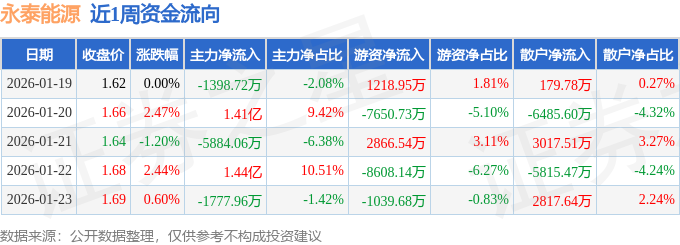 资金流向数据方面,本周永泰能源主力资金合计净流入1.95亿元,游资资金合计净流出1.32亿元,散户资金合计净流出6286.14万元。本周资金流向一览见下表: