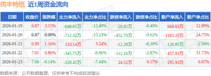 资金流向数据方面,本周民丰特纸主力资金合计净流出1893.39万元,游资资金合计净流出573.54万元,散户资金合计净流入2466.93万元。本周资金流向一览见下表: