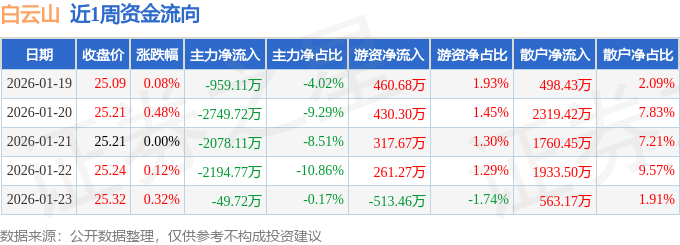资金流向数据方面,本周白云山主力资金合计净流出8031.43万元,游资资金合计净流入956.46万元,散户资金合计净流入7074.97万元。本周资金流向一览见下表: