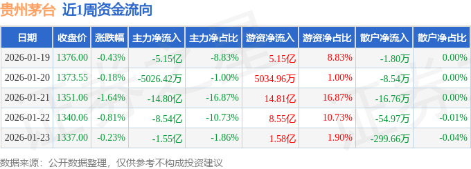 资金流向数据方面,本周贵州茅台主力资金合计净流出30.55亿元,游资资金合计净流入30.59亿元,散户资金合计净流出381.72万元。本周资金流向一览见下表: