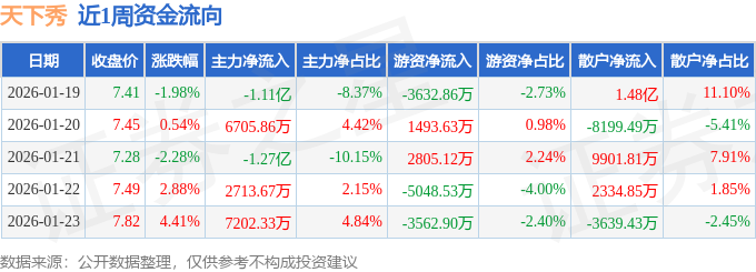 资金流向数据方面,本周天下秀主力资金合计净流出7224.49万元,游资资金合计净流出7945.53万元,散户资金合计净流入1.52亿元。本周资金流向一览见下表: