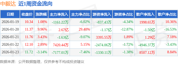 资金流向数据方面,本周中毅达主力资金合计净流入9520.0万元,游资资金合计净流出1.29亿元,散户资金合计净流入3421.79万元。本周资金流向一览见下表: