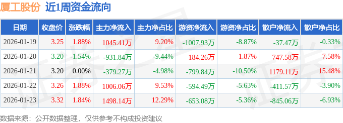 资金流向数据方面,本周厦工股份主力资金合计净流入2238.49万元,游资资金合计净流出2871.09万元,散户资金合计净流入632.59万元。本周资金流向一览见下表: