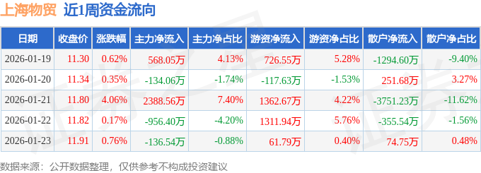 资金流向数据方面,本周上海物贸主力资金合计净流入1729.61万元,游资资金合计净流入3345.32万元,散户资金合计净流出5074.94万元。本周资金流向一览见下表:
