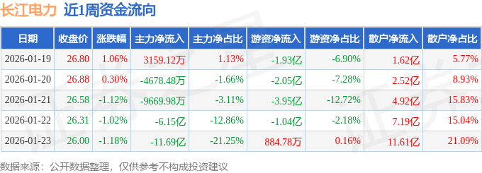 证券之星消息,截至2026年1月23日收盘,长江电力(600900)报收于26.0元,较上周的26.52元下跌1.96%。本周,长江电力1月20日盘中最高价报26.94元。1月23日盘中最低价报25.96元,股价触及近一年最低点。长江电力当前最新总市值6361.74亿元,在电力板块市值排名1/102,在两市A股市值排名21/5182。