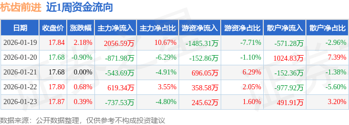 资金流向数据方面,本周杭齿前进主力资金合计净流入522.72万元,游资资金合计净流出337.91万元,散户资金合计净流出184.81万元。本周资金流向一览见下表: