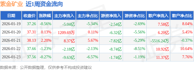 资金流向数据方面,本周紫金矿业主力资金合计净流出8.36亿元,游资资金合计净流出27.16亿元,散户资金合计净流入35.52亿元。本周资金流向一览见下表: