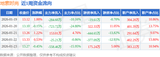 资金流向数据方面,本周地素时尚主力资金合计净流出1438.97万元,游资资金合计净流出343.77万元,散户资金合计净流入1782.74万元。本周资金流向一览见下表: