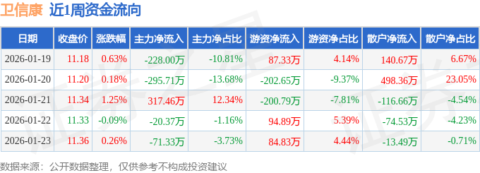 资金流向数据方面,本周卫信康主力资金合计净流出297.96万元,游资资金合计净流出136.39万元,散户资金合计净流入434.35万元。本周资金流向一览见下表: