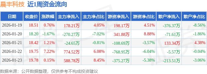 资金流向数据方面,本周晨丰科技主力资金合计净流入1246.59万元,游资资金合计净流出712.86万元,散户资金合计净流出533.72万元。本周资金流向一览见下表: