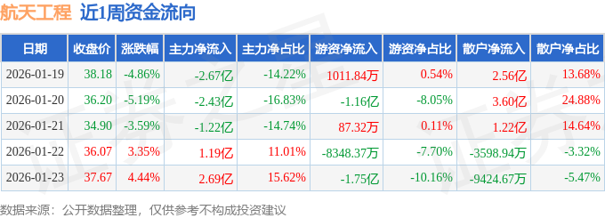 资金流向数据方面,本周航天工程主力资金合计净流出2.43亿元,游资资金合计净流出3.64亿元,散户资金合计净流入6.07亿元。本周资金流向一览见下表: