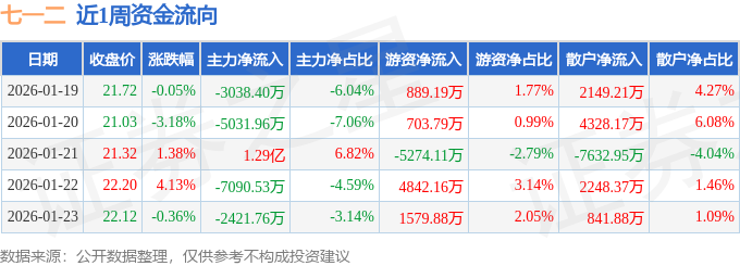 资金流向数据方面,本周七一二主力资金合计净流出4675.59万元,游资资金合计净流入2740.91万元,散户资金合计净流入1934.68万元。本周资金流向一览见下表: