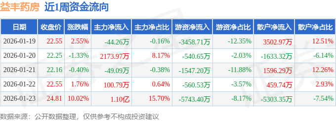 资金流向数据方面,本周益丰药房主力资金合计净流入1.32亿元,游资资金合计净流出1.19亿元,散户资金合计净流出1377.68万元。本周资金流向一览见下表:
