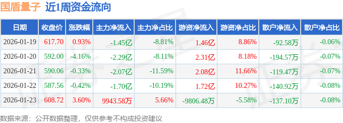 资金流向数据方面,本周国盾量子主力资金合计净流出6.51亿元,游资资金合计净流入6.58亿元,散户资金合计净流出684.62万元。本周资金流向一览见下表: