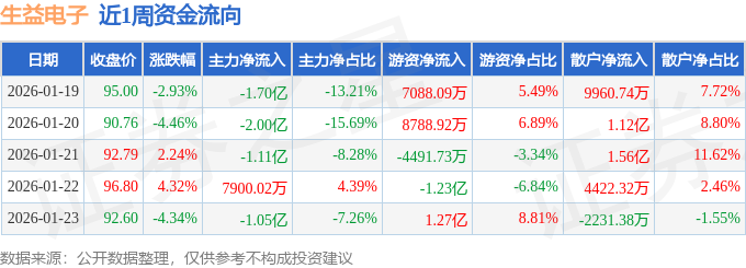 资金流向数据方面,本周生益电子主力资金合计净流出5.08亿元,游资资金合计净流入1.18亿元,散户资金合计净流入3.9亿元。本周资金流向一览见下表: